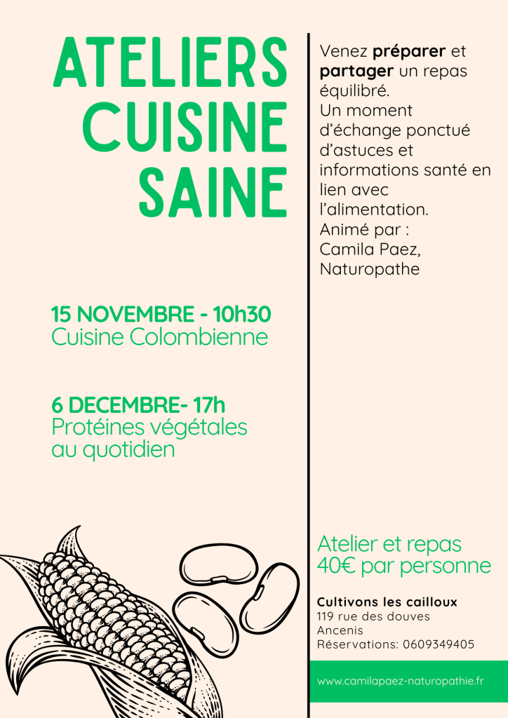 Les ateliers seront déclinés selon les saisons ou des thématiques différentes, vous allez pratiquer et échanger dans une ambiance conviviale autour des préparations, alliant simplicité, saveur et créativité. Il ne s’agit pas d’un cours de cuisine, mais des moments d’apprentissage ponctués d’astuces et informations santé en lien avec l’alimentation.